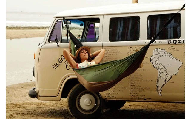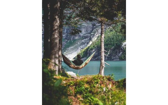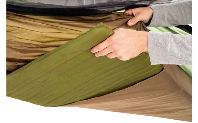 Die Hängematte besitzt ein diagonales Einschubfach mit verstärkten Nähten für eine Isomatte für alle typischen Trekking-Isomatten. Sie verhindert somit effektiv, dass die Matte während der Nacht verrutscht. Damit schläfst Du auch an kälteren Tagen warm und sicher in Deiner Outdoor-Hängematte.