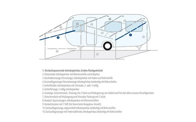 Spannstab und Firststab teleskopierbar, Enden flachgedrückt. Passend um das Vordach zu Spannen.