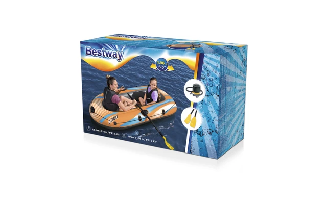 Das Bestway Kondor Elite 1000 ist ein aufblasbares Schlauchboot, welches Platz für einen Erwachsenen und ein Kind mit einem Gesamtgewicht von 120 kg. Dank des aufblasbaren Bodens können Sie während Ihres Ausflugs den bestmöglichen Komfort genießen. Es lässt sich mühelos aufpumpen, sodass Sie mehr Zeit auf dem Wasser als mit dem Aufbau verbringen können. Das Kondor Elite™ 2000 ist zudem mit zwei Luftkammern ausgestattet, was nochmal für zusätzliche Sicherheit sorgt. Der an der Vorderseite des Schlauchbootes angebrachte Griff ermöglicht einen einfachen Transport von und zum Wasser. Außerdem ist das Schlauchboot mit robusten Ruderdollen ausgestattet mit denen die Ruder an Ort und Stelle gehalten werden. Die umlaufende Halteleine mit integrierten Seildurchführungen ermöglicht das Festmachen oder Verbinden mit anderen Booten. Dieses Set enthält auch ein Paar Ruder sowie eine Fußpumpe, mit der das Schlauchboot leicht aufgeblasen werden kann. Ob zum Rudern, Angeln oder einfach nur zum Dahintreiben – dieses Set verspricht einen unvergesslichen Sommer.
