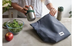 Hergestellt aus recyceltem Polyethylenterephthalat (PET) (Dinge wie Plastikflaschen) hat diese Tasche genügend Kapazität, um all Ihre Speisen und Getränke mitzunehmen. Das ansprechende Design ist besonders einfach in der Handhabung – weite Öffnung zum Füllen und praktischer Rollup Verschluss für den sicheren Transport.