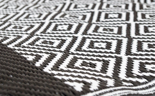 Eine schöner Teppich in schwarz und weiß. Auf beiden Seiten befinden sich ansprechende Motive, so dass der Teppich beidseitig genutzt werden kann. Dieser ist wasserdicht, schimmelresisten und UV-beständig, was eine lange Lebensdauer gewährleistet. Ideal auch als (Vor)Zeltteppich, unter dem Vorzelt, im Park, am Strand oder im Garten. Hergestellt aus einem hochwertigen und leichten 100% Polypropylen 380 gr/m ².