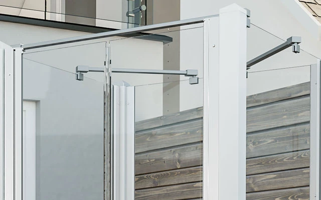 Set bestehend aus: 4 Pfosten, 3 Glaselemente, 1 Pendeltüre, 1 Set 45° Stabilisator, 1 90° Stabilisator