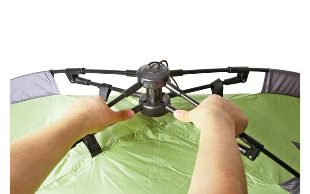Automatik-Igluzelt für 2 Personen. Dank spezieller Seilzugtechnik sekundenschnell aufgebaut und einsatzbereit. Das Abbauen braucht unwesentlich länger. Einzeldachausführung mit großer RV-Tür. Inkl. Heringe und Packsack.