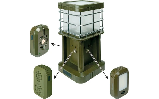 Diese Schwaiger Campingleuchte ist derperfekte Begleiter bei jedem Ausflug, egal ob in die Wildnis oder an den Campingplatz. Die Leuchte besteht aus einer Haupteinheit sowie 3 abnehmbaren Zusatzelementen (2x Leuchte + 1x Bluetooth® Lautsprecher). Die Stromversorgungder Haupteinheit übernimmt ein 5.000 mAh großer Lithium Akku, welcher via Magnetkontakten zusätzlich die montierten Elemente und deren Akkus lädt.