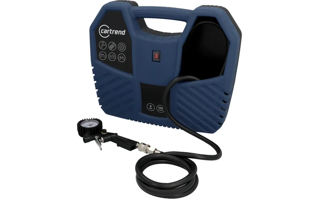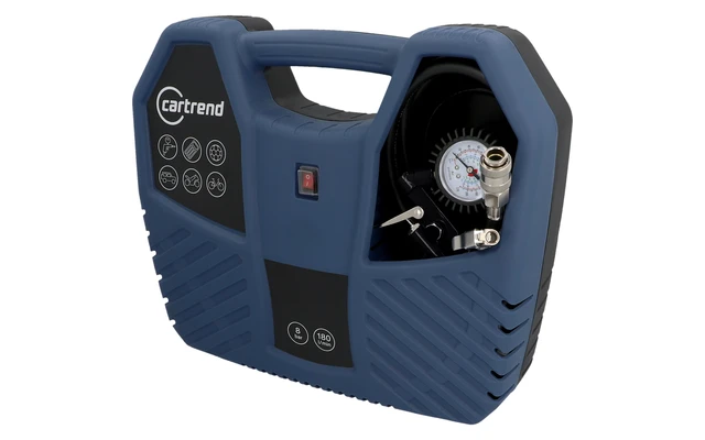 Der cartrend Druckluft Kofferkompressor vereint Leistung, Vielseitigkeit und maximalen Komfort. Das handliche Gerät arbeitet mit einem Betriebsdruck von bis zu 8 bar. Mit der hohen Abgabeleistung von 180 Litern/min ist der Kofferkompressor ideal für das Aufpumpen von Auto- und Fahrradreifen sowie Luftmatratzen, Schwimmbecken oder Bällen geeignet. Auch das Aus- und Abblasen von Werkstücken oder Oberflächen gehört zu den Einsatzfeldern des kompakten Kraftpakets.