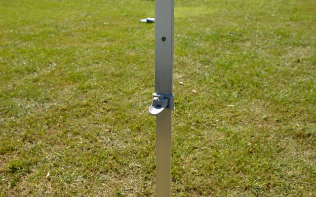 - Minutenschneller Auf- und Abbau – Stützbeine und Spannstangen werden aus der Frontleiste ausgeklappt
