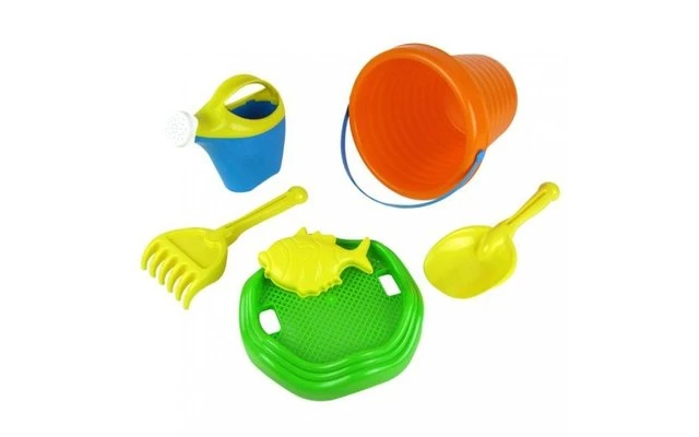 Mit der 7-teiligen Sandeimer-Garnitur (Eimer, Gießkanne, Schaufel, Rechen, Sieb, 1 Form) gelingt jedes Sand-Kunstwerk mühelos.