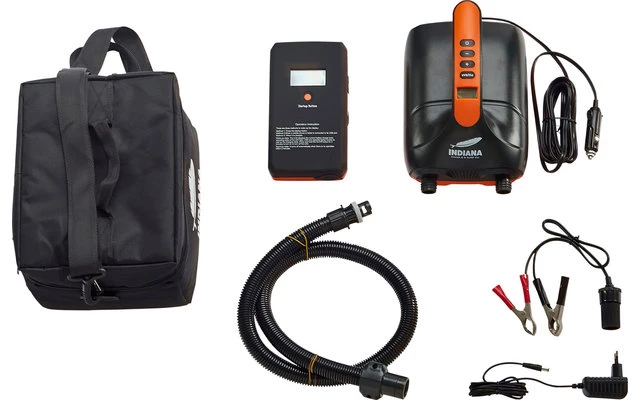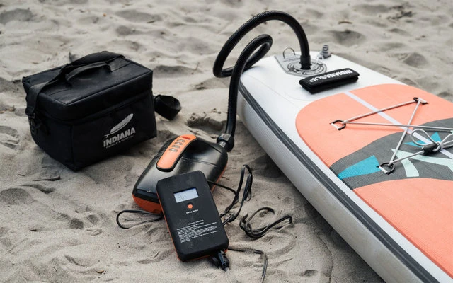 Die Indiana Batterie Pumpe hat eine Lithiumbatterie und einen USB-Anschluss. Der zweistufige Motor für einen maximalen Luftstrom von 350 Litern pro Minute ermöglicht es Ihnen, Ihre Tafel in wenigen Minuten fertig zu stellen. Die Pumpe stoppt automatisch, wenn der Luftdruck das gewünschte Niveau erreicht.