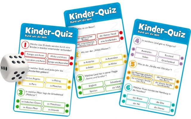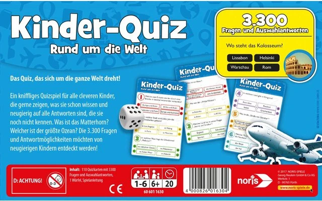 Das beliebte Kinder-Quiz als Variante „Rund um die Welt“ für Zuhause und Unterwegs. Das Quiz besteht insgesamt aus 3300 Fragen und Auswahlmöglichkeiten. Geeignet ab 6 Jahren. Gespielt werden kann das neue Kinder Quiz mit bis zu sechs Personen und somit wird dieses Spiel zu einen Spielspaß für die ganze Familie.