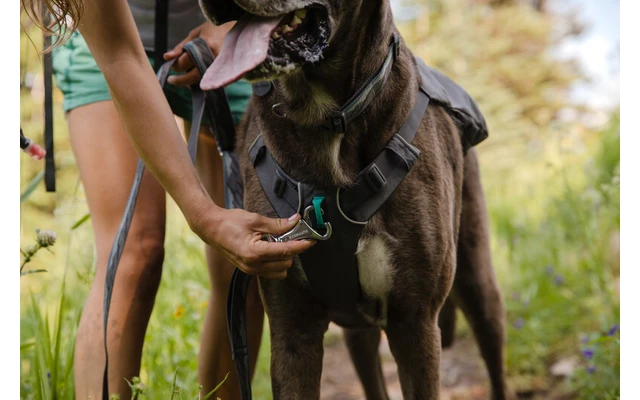- Zwei Leinenbefestigungspunkte: Aluminium-V-Ring am Rücken und verstärkte Gurtbandschlaufe an der Brust