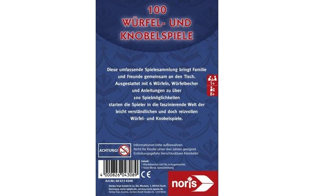 100 Würfel- und Knobelspiele sind eine reichhaltige Sammlung beliebter Würfel- und Knobelspiele wie Yatzy bzw. Knubbel. Im Spiel ist außerdem ein Würfelbecher enthalten.